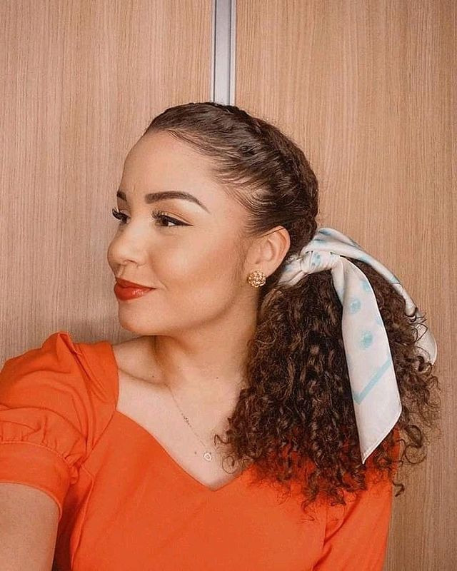 Make a chic statement with a curly ponytail accessorized with a bold scrunchie. This stylish hairstyle effortlessly combines grace and fun and is perfect for adding a personal touch to any look, be it a casual day out or a special occasion.