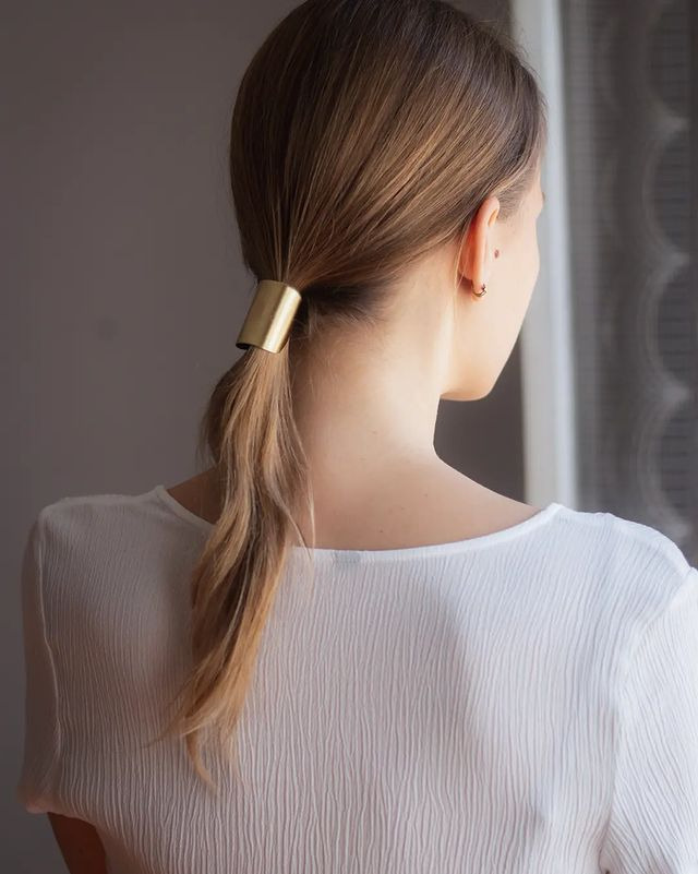 Add elegance to your look with a low ponytail and stylish cuff hair accessories. This chic hairstyle effortlessly combines sophistication and modern charm, making it perfect for any occasion, be it a casual outing or a special event.