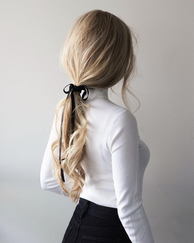 Go for a casual vibe with a loose ponytail highlighted by a delicate lace ribbon. This effortless hairstyle exudes charming, effortless elegance and is perfect for adding a whimsical touch to any occasion.