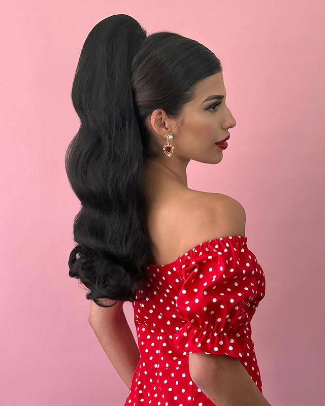 Classic elegance with a retro high ponytail reminiscent of the glamor of bygone eras. This timeless hairstyle exudes sophistication and adds vintage charm to any occasion.