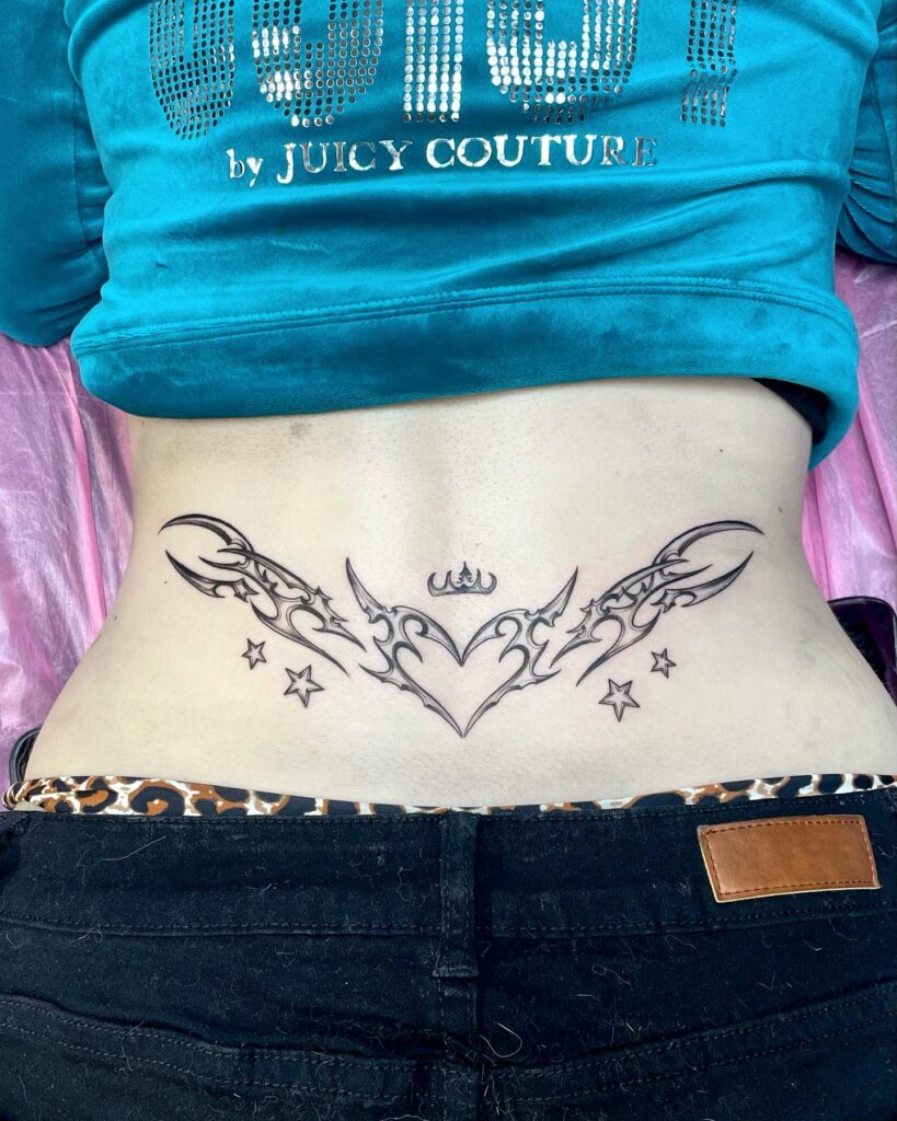 Тату Племенное сердце с короной и звездами на пояснице