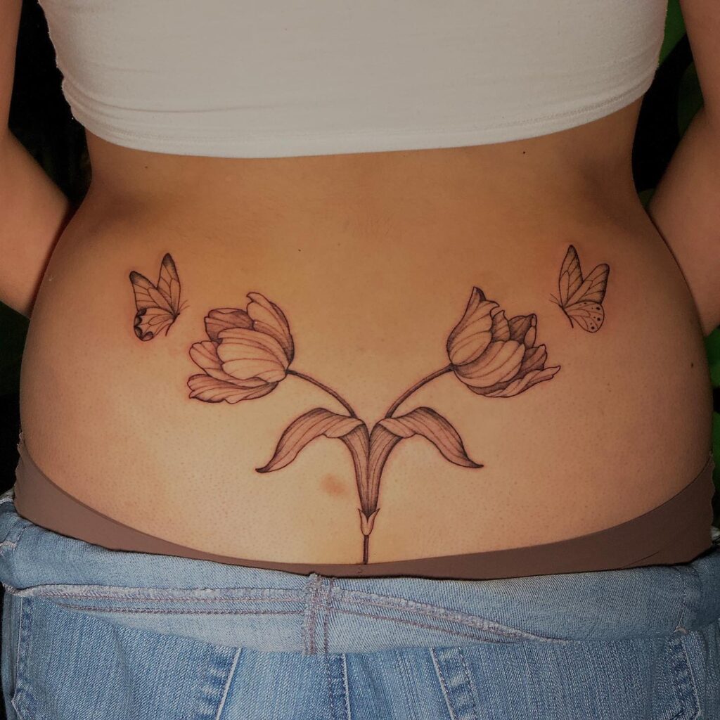 Эта татуировка на пояснице подчеркивает тонкий баланс естественной красоты и элегантности с тюльпанами и бабочками.