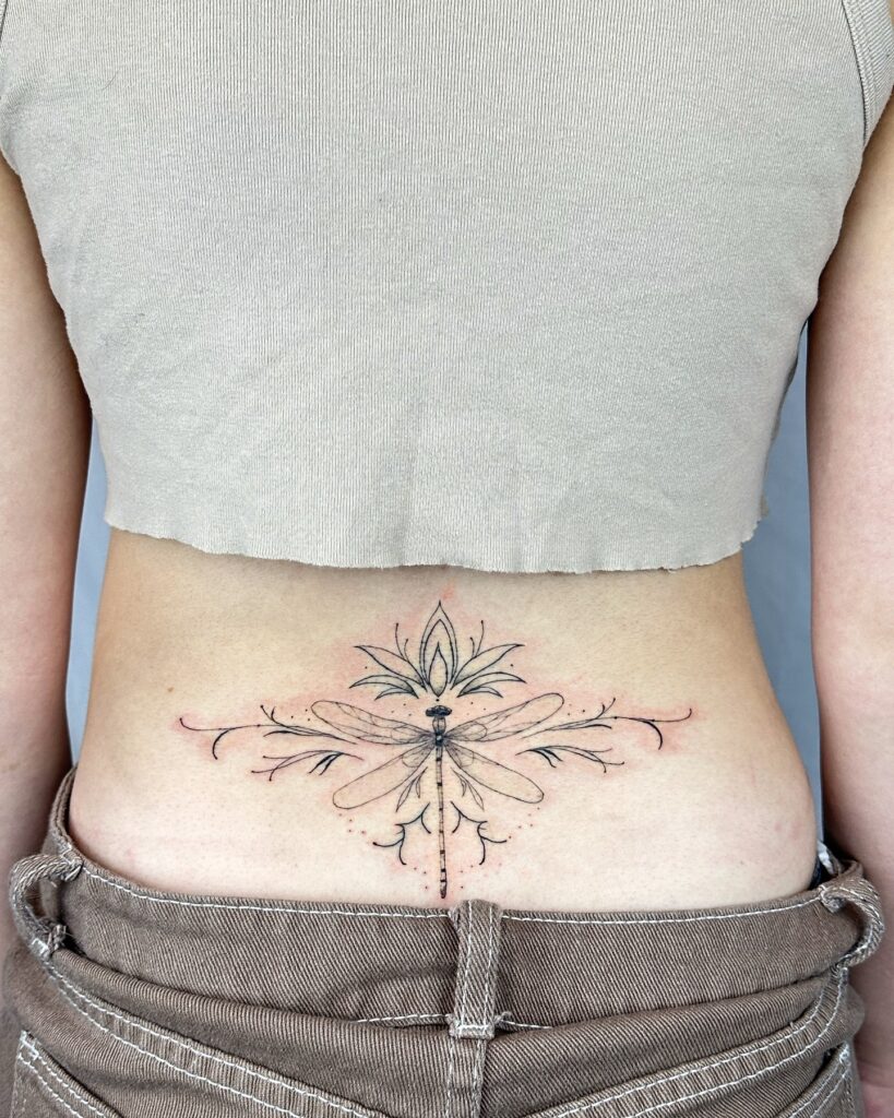 Эта татуировка на пояснице сочетает в себе стрекозу и цветок лотоса, создавая дизайн, полный баланса и символизма.
