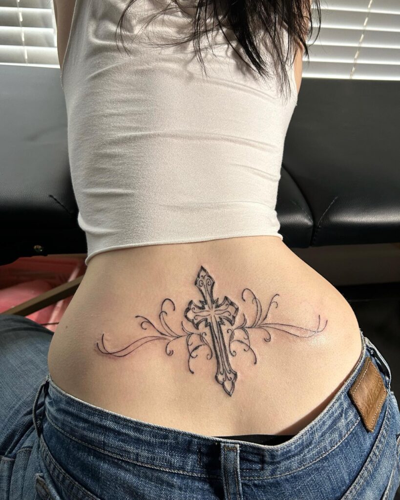 Эта татуировка на пояснице представляет собой красиво детализированный крест, окруженный закрученными орнаментальными акцентами, создающими мощный, но элегантный дизайн.
