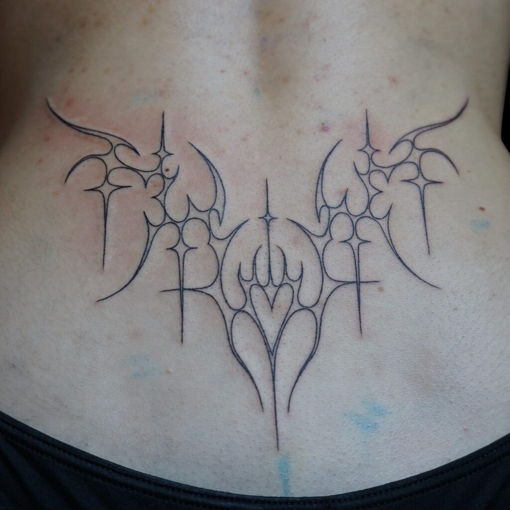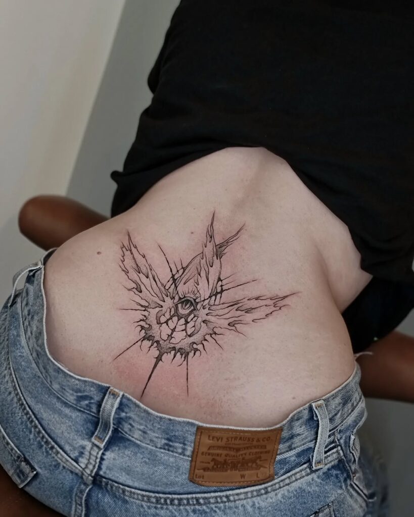 Симметричные линии образуют угловатый узор, придающий татуировке острый, но сбалансированный вид. Его чистая планировка усиливает естественную плавность нижней части спины, делая ее привлекательной, но не подавляющей.