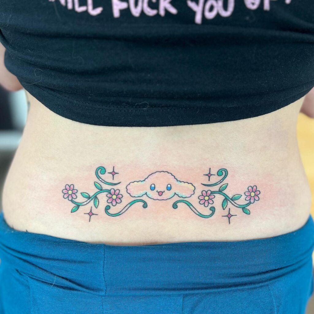 Татуировка на пояснице с цветочным циннамороллом