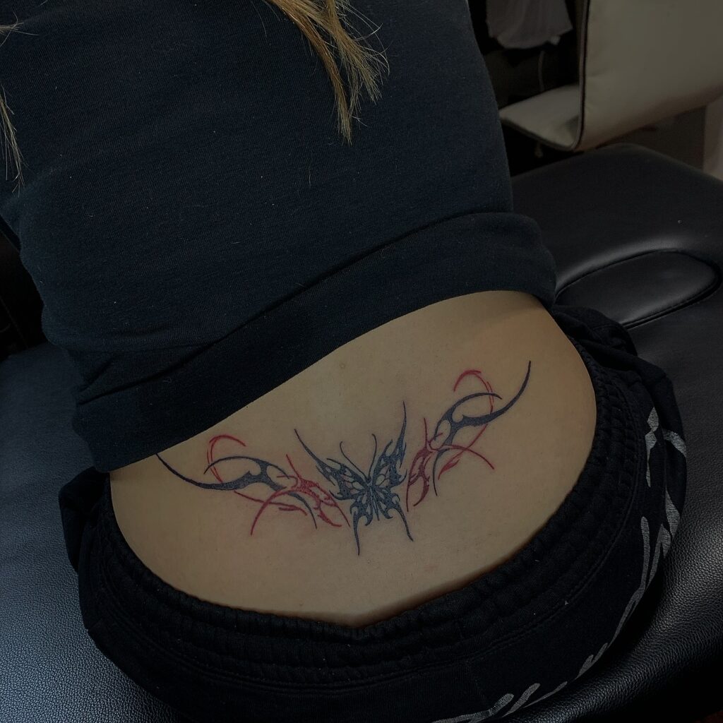 Эта татуировка на пояснице сочетает в себе элегантность бабочки и смелость узоров в племенном стиле.