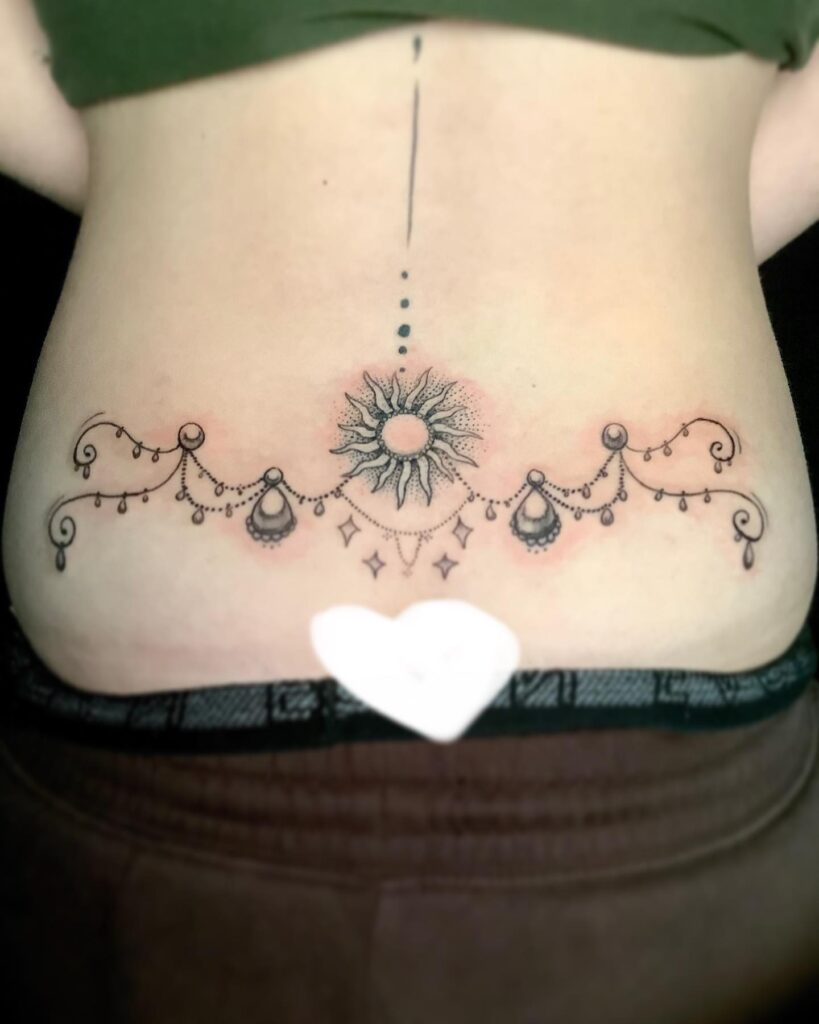 Тату Солнце и декоративные цепочки на пояснице