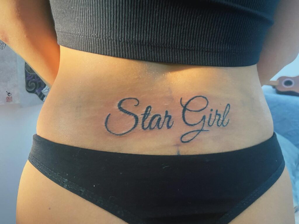 Эта татуировка демонстрирует фразу Star Girl, написанную элегантным шрифтом, что придает ей стильный и индивидуальный вид.