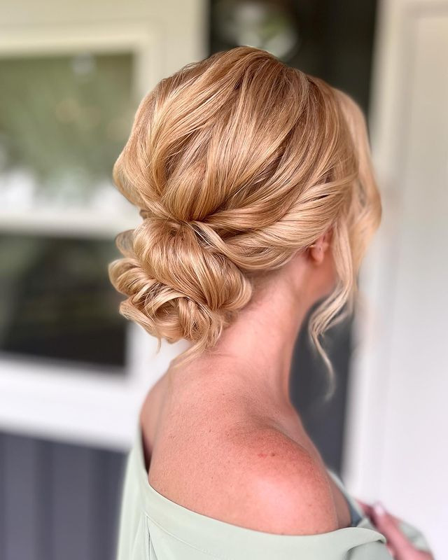 An elegant low knot is a sophisticated hairstyle that exudes timeless charm. In this style, the hair is neatly gathered and twisted into a sleek knot at the back of the head, while soft, wide strands add volume and a touch of romance. Elegant lines and sophisticated finishes make it ideal for formal occasions, while the fine texture and loose curls make it modern and effortlessly chic. This hairstyle is versatile and attractive. It’s ideal for medium-length hair and creates a sophisticated yet casual look.