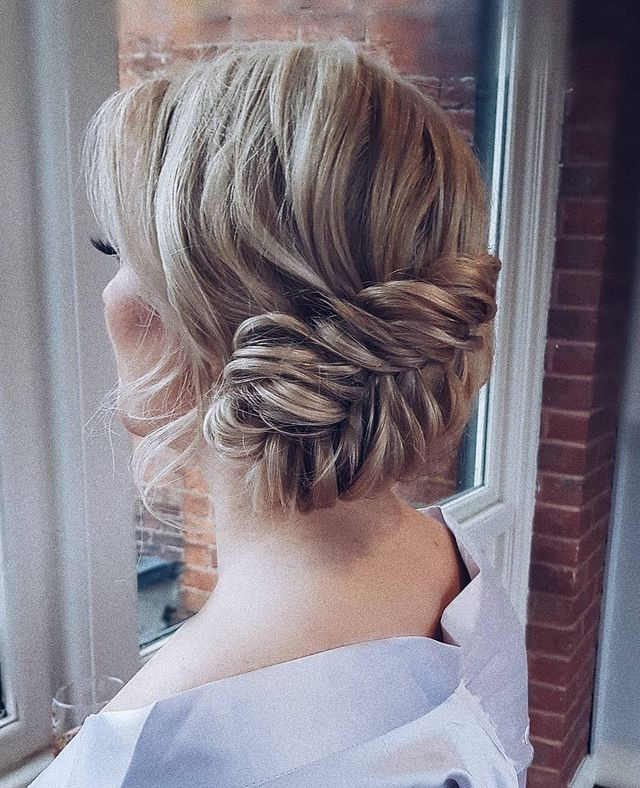 The hairstyle consists of sleek hair gathered and braided into a sophisticated updo, creating a clean and sophisticated look. The twist adds elegance and makes it ideal for formal events or weddings. The style also includes some volume at the crown and some loose strands that frame the face, adding softness and balance to the overall look. Ideal for medium length hair, offering sophisticated and timeless elegance.