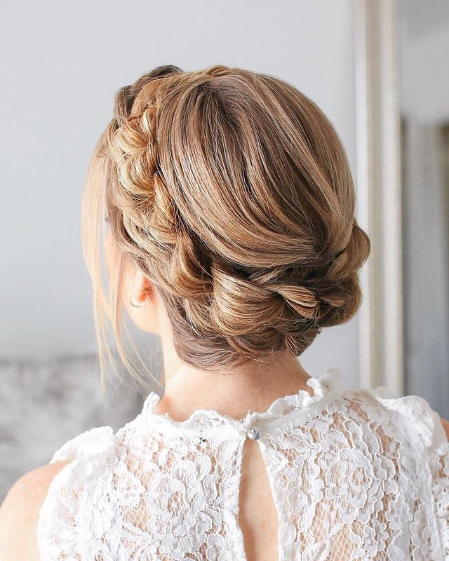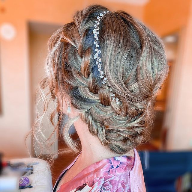 This hairstyle is an elegant braided hairstyle that combines soft textured braids with a beautiful jeweled headpiece. The braids are intricately woven and pulled into a chic updo, creating a sophisticated and romantic look. The headpiece adds sparkle and sophistication, making this style ideal for weddings or other formal events. Loose curls that frame the face give the hairstyle a romantic look, while braids add texture and detail. This hairstyle is ideal for medium to long hair and gives a timeless and graceful look.