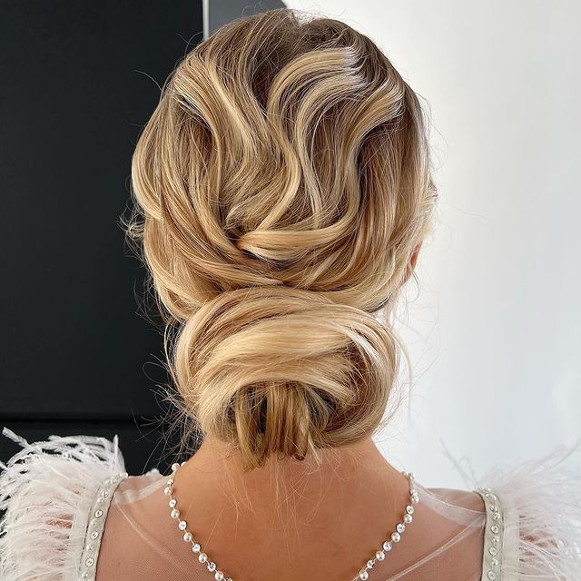 This elegant hairstyle features a beautifully twisted low bun that combines intricate details with a sleek, polished finish. The hair is softly curled and pinned at the back of the head, creating a sophisticated and sophisticated look. Soft body waves are integrated into the curves, adding depth and texture while maintaining a graceful appearance. This hairstyle is perfect for formal events, weddings or any occasion where you want to show off a timeless and chic style. Ideal for medium length hair, combining elegance and lightness.
