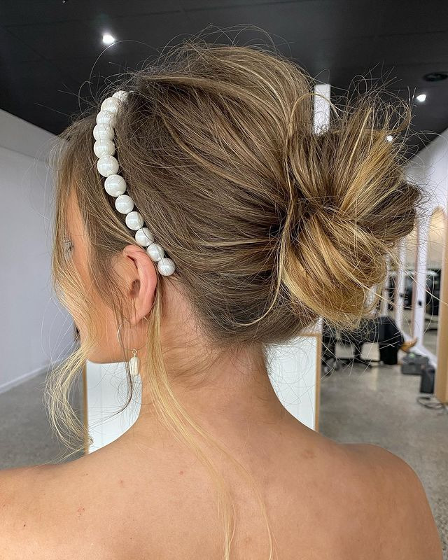 This hairstyle features a beautiful textured bun that adds a modern twist to a classic hairstyle. The bun has a deliberately careless voluminous texture, which creates a relaxed but stylish look. A pearl headband is added to the mix, adding elegance and sophistication to the overall look. Loose curls that frame the face soften the look and make it perfect for casual and formal occasions. This hairstyle is ideal for medium length hair and creates a chic, versatile style that combines elegance with a casual vibe.
