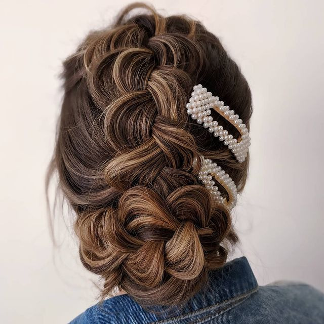 This beautiful braided hairstyle combines an intricate braid with a chic, modern twist. The braid is braided tightly and pulled back slightly to add volume and texture, then placed into a bun at the back of the head. The look is completed with elegant pearl clips, adding a touch of sophistication and glamour. This hairstyle is ideal for formal events, weddings or any event where you want to showcase a stylish and elegant look, making it ideal for medium to long hair lengths.