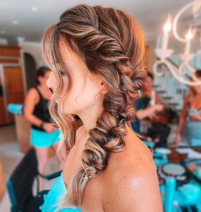 This hairstyle features a loose, textured fishtail braid that flows elegantly over the shoulder. The braid begins in soft, voluminous waves at the crown, creating a casual and bohemian look. Loose strands frame the face, adding softness and romance to the overall style. Perfect for beach weddings, casual outings or any occasion where you want to create a casual yet stylish vibe, this fishtail braid is ideal for medium to long hair, offering the perfect combination of texture and elegance.