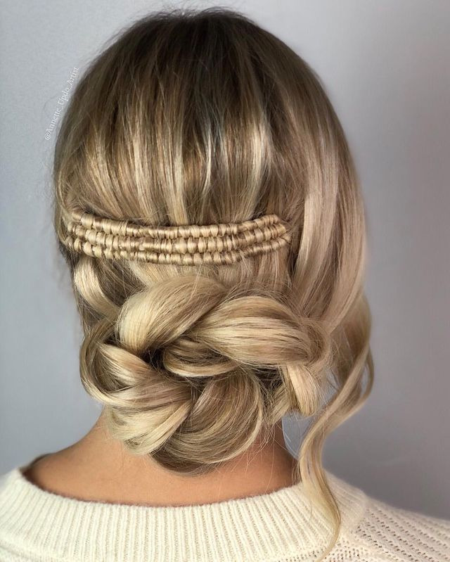 This hairstyle features a sophisticated twisted low bun with an infinity accent braid. The hair is elegantly pulled back into a low bun at the nape of the neck, while a braided accent reminiscent of an infinity symbol wraps around the top of the bun, adding a unique and intricate detail. An endless braid adds texture and elegance to the look, making it a great choice for formal events or occasions when you want to show off a sophisticated look. Loose curls frame the face, softening the overall look. This hairstyle is ideal for medium length hair and combines modern chic with timeless elegance.