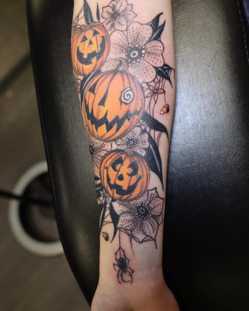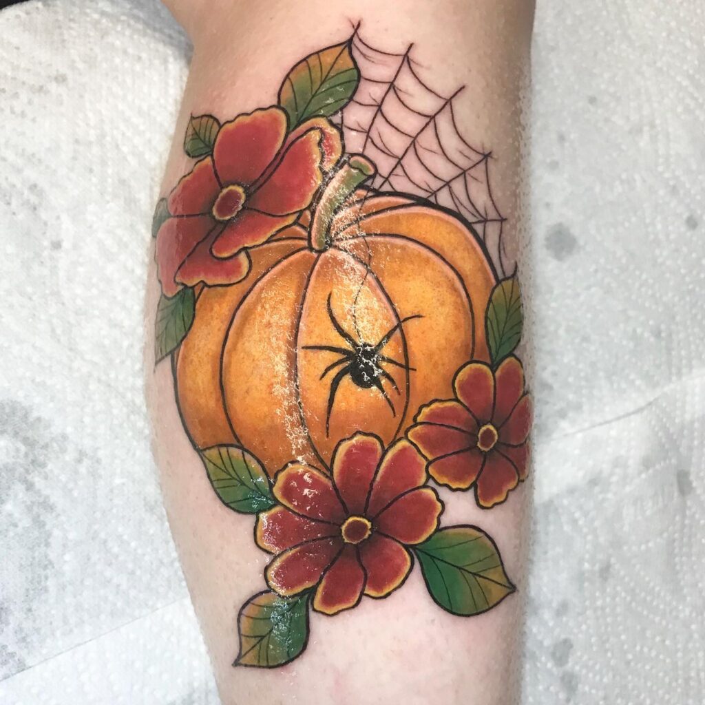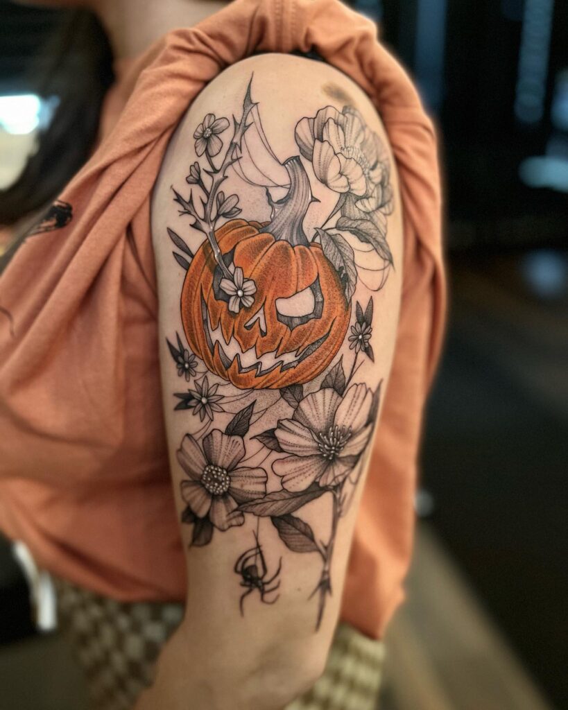 На этой татуировке изображена ярко-оранжевая тыква, окруженная яркими красными цветами и пышными зелеными листьями. Черный паук, ползающий по тыкве, добавляет жуткую деталь, связывая ее с темой Хэллоуина.
