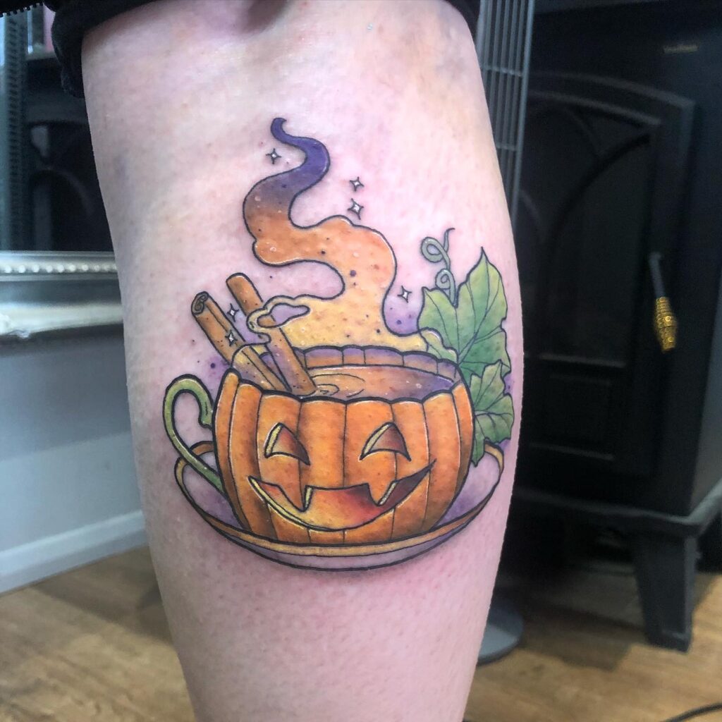 Эта татуировка прекрасно сочетает в себе образы Хэллоуина и сезонный уют, что делает ее идеальной для любителей тыквенных специй и любителей осени.