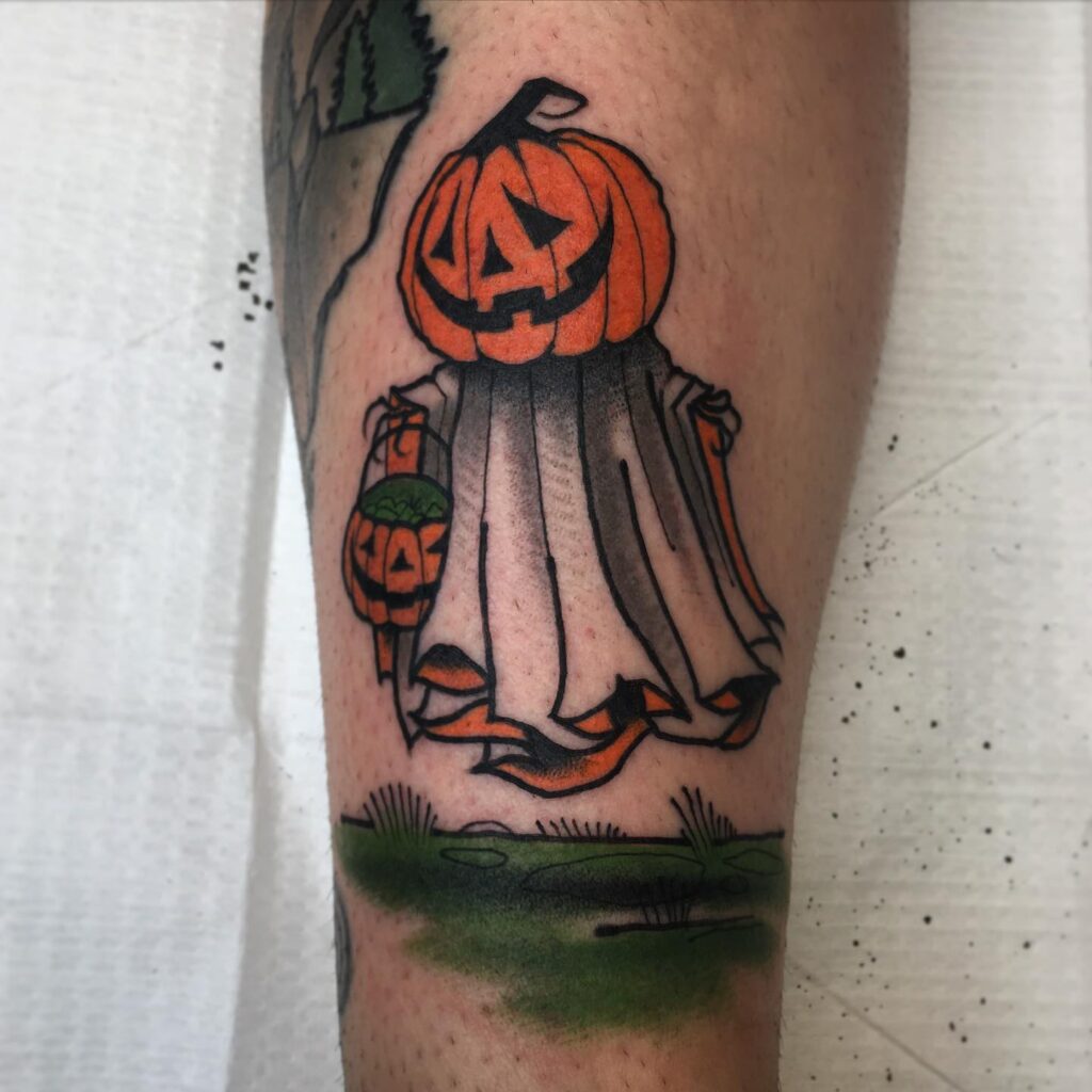 На этой татуировке изображен игривый персонаж Хэллоуина с головой фонаря из тыквы, задрапированной призрачной белой простыней.