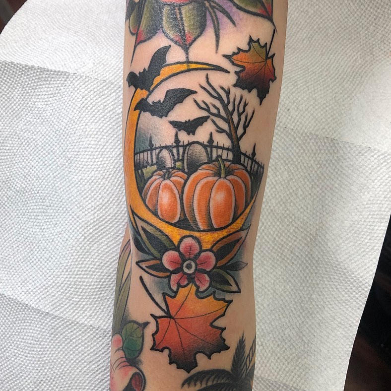 Сочетание ярких цветов и тонких теней создает глубину, что делает эту татуировку ярким данью осени и ночам Хэллоуина.