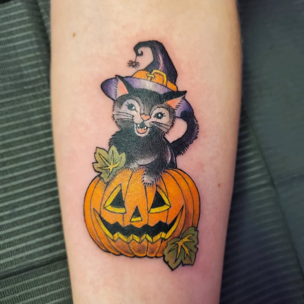 Тату кота-ведьмы и тыквы