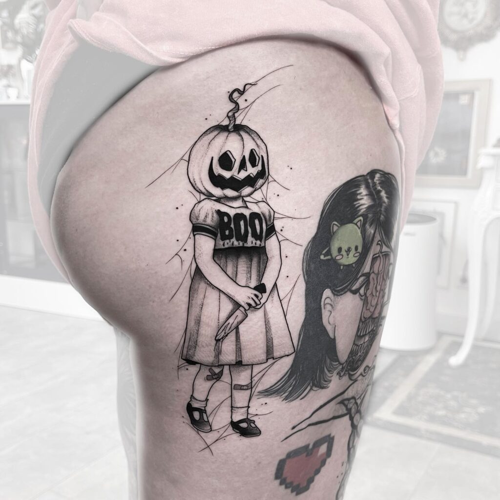 На этой пугающей татуировке изображена молодая девушка с вырезанным фонарем из тыквы вместо жуткой тыквенной головы. Она носит платье с смелой надписью «BOO» на груди, добавляющей игривую, но тревожную деталь.