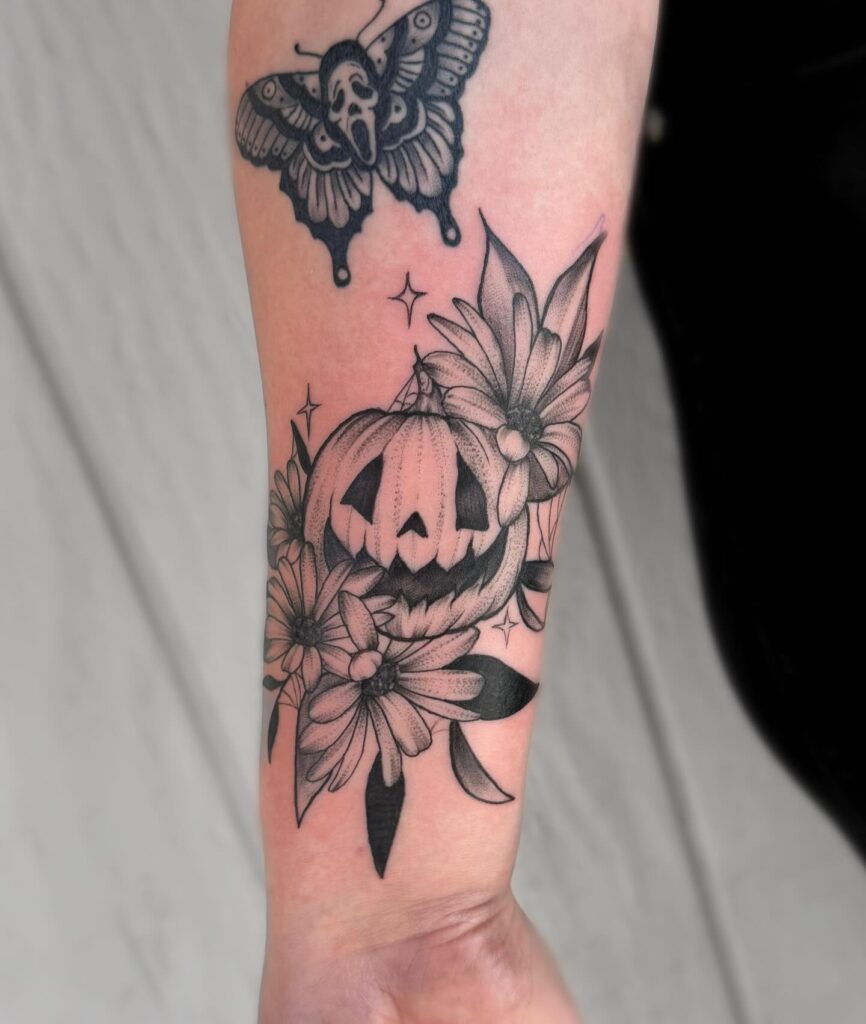 Эта татуировка сочетает в себе сезонное очарование с запоминающимися деталями и идеально подходит для тех, кто хочет баланса между цветочной красотой и пугающим Хэллоуином.