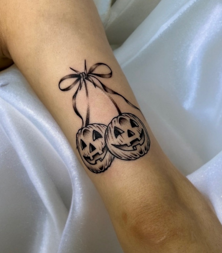 Эта татуировка представляет собой два фонарика из тыквы, связанных между собой изящным бантиком, что придает дизайну игривый и уникальный вид. У каждой тыквы есть веселое резное лицо, а ее беззаботное выражение лица добавляет нотку веселья на Хэллоуин.
