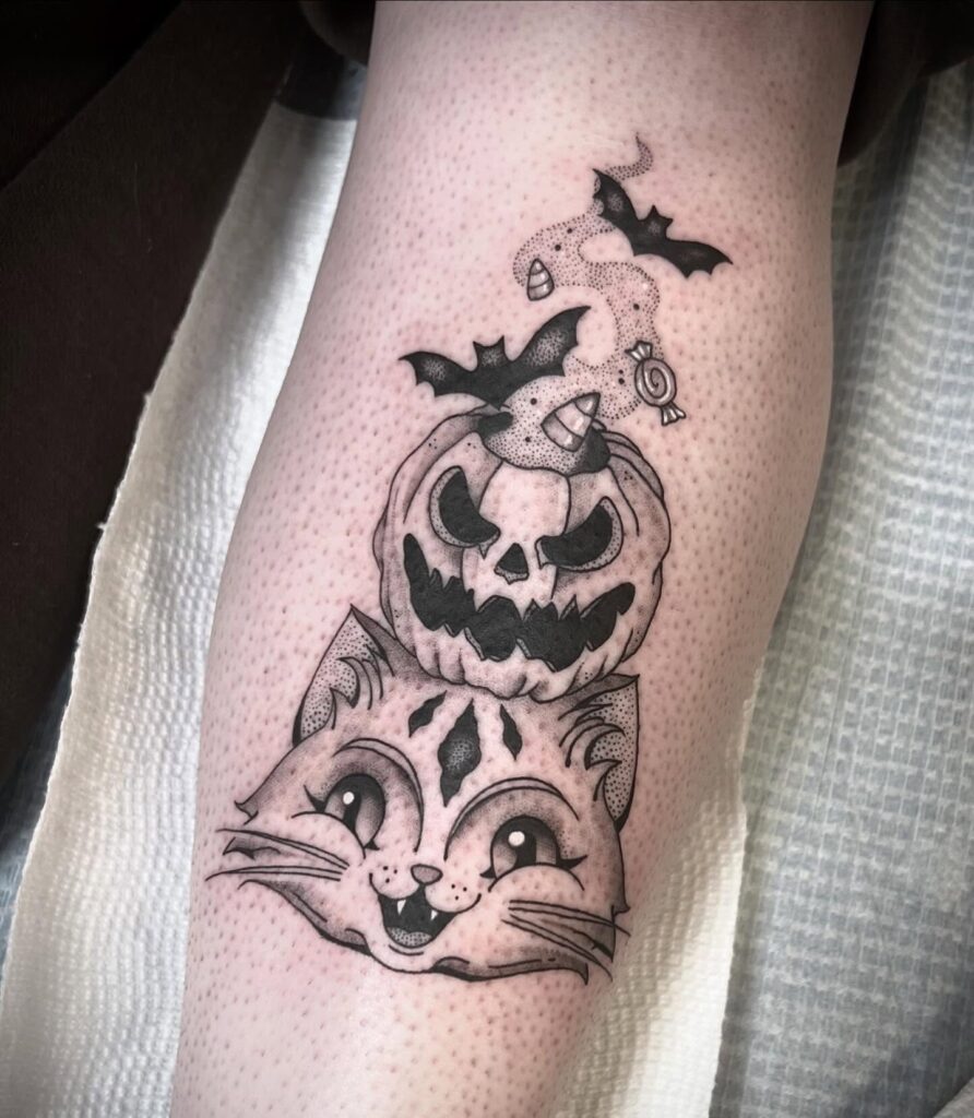 Эта татуировка, сочетающая в себе привлекательность и жуткие детали, передает веселый и праздничный дух, что делает ее идеальной как для любителей кошек, так и для любителей Хэллоуина.
