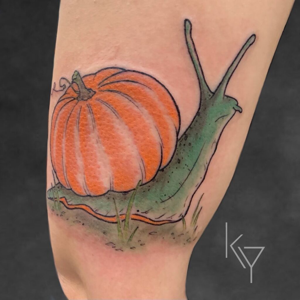 Эта причудливая татуировка превращает тыкву в раковину улитки, сочетая юмор и творчество. Ярко-оранжевая тыква естественно сидит на спине улитки, красиво контрастируя с нежно-зеленым телом.