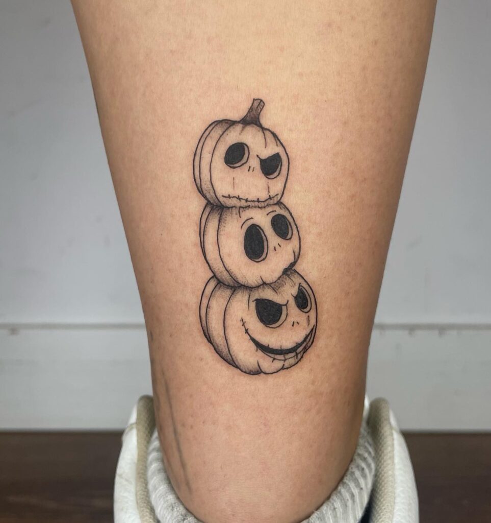 На этой татуировке изображены три тыквы, сложенные друг на друга, каждая из которых имеет уникальное резное выражение.