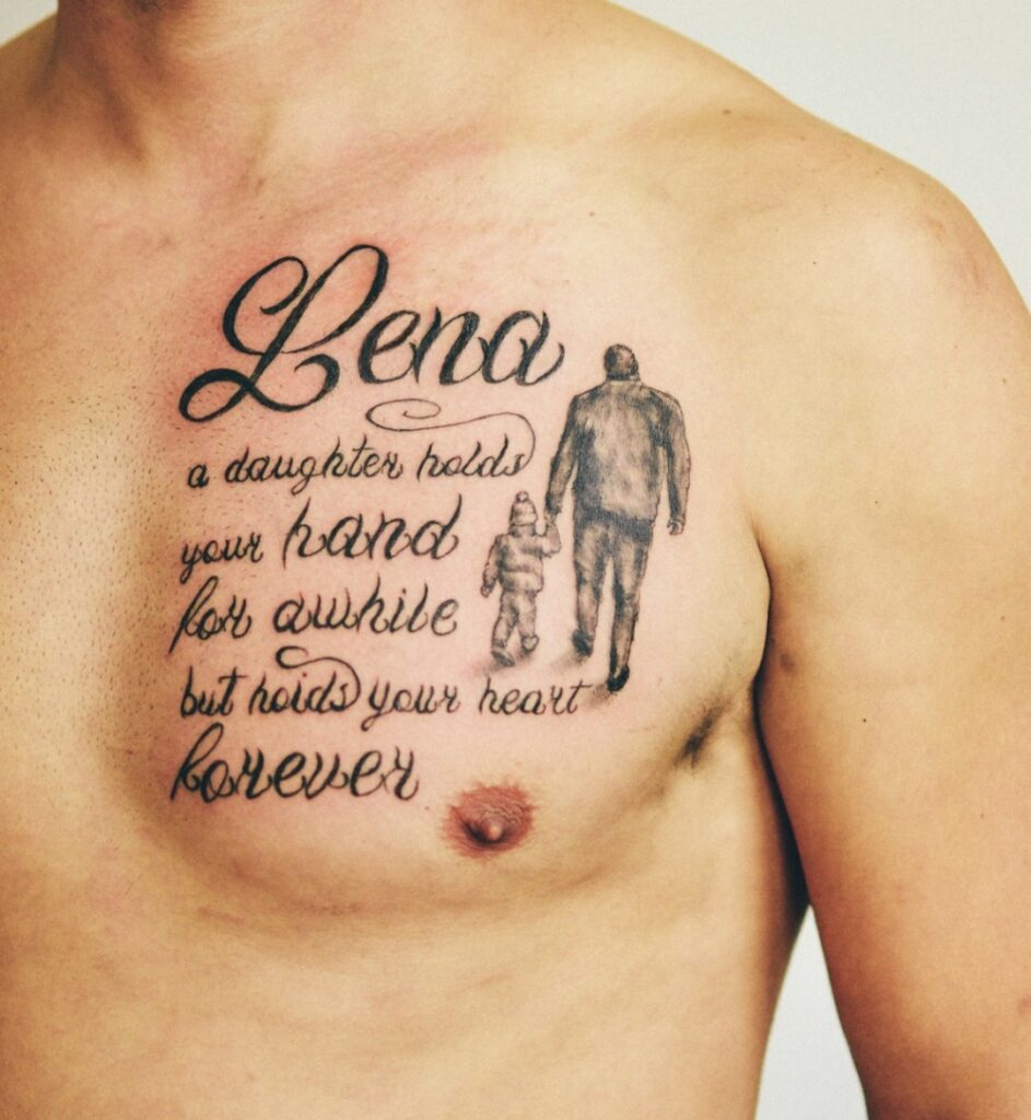 This heartfelt chest tattoo features the name “Lena” prominently displayed, accompanied by the touching phrase, “A daughter holds your hand for a while but holds your heart forever.” The design also includes a detailed image of a father walking hand in hand with his young daughter, symbolizing the enduring bond and guidance a father provides.
