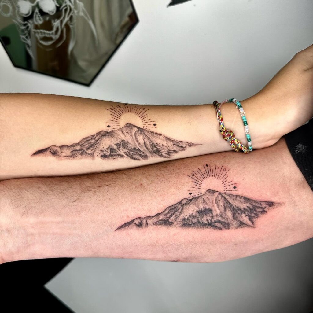 These matching tattoos feature a detailed mountain range with the sun rising above it, symbolizing strength, stability, and new beginnings. The intricate shading brings the mountains to life, while the sun’s rays emanate warmth and hope.