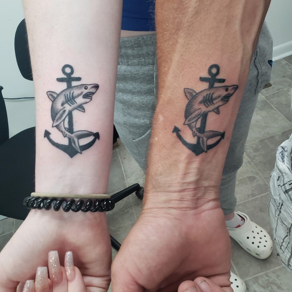 These matching tattoos for father and daughter combine the strength and stability of an anchor with the fierce and powerful image of a shark. The design symbolizes their unbreakable bond, with the anchor representing how they keep each other grounded, and the shark showcasing their shared determination and resilience.