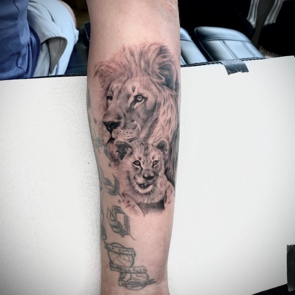 The detailed shading and realistic portrayal of the lions capture the essence of their relationship, making this tattoo a meaningful tribute to the unconditional love, courage, and connection shared between father and daughter.