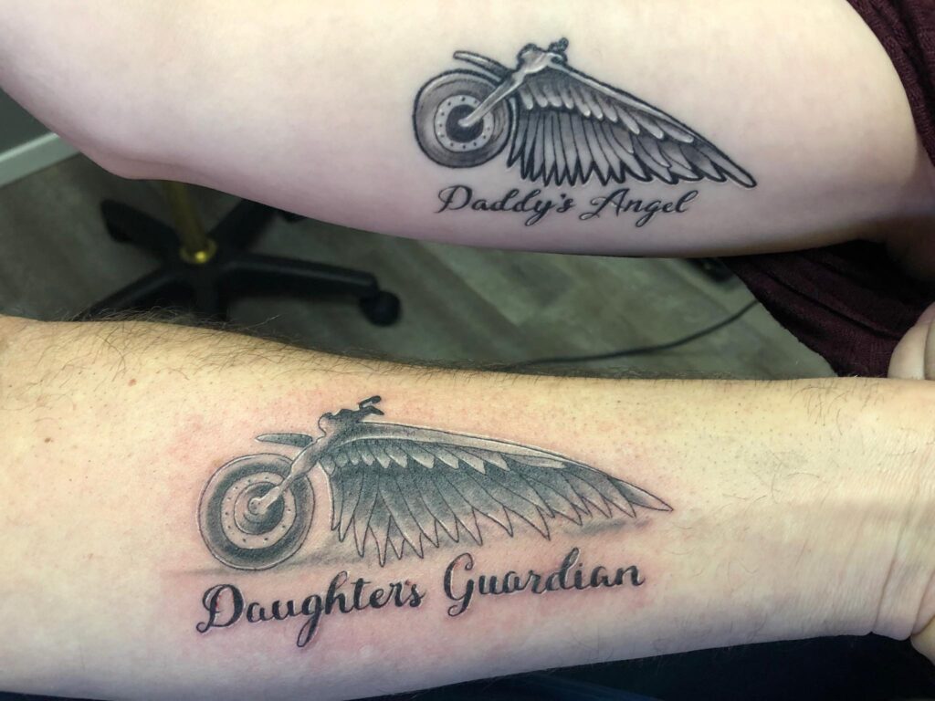 These matching tattoos feature a motorcycle with a detailed wing, symbolizing freedom, protection, and the adventurous spirit shared between a father and daughter. The daughter’s tattoo reads “Daddy’s Angel,” emphasizing her father’s protective role, while the father’s tattoo says “Daughter’s Guardian,” highlighting his commitment to always being there for her.