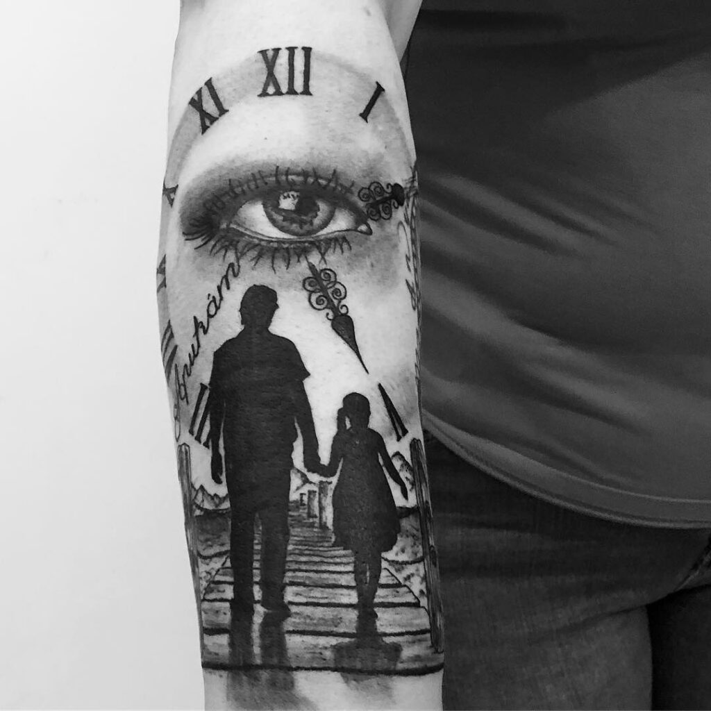 This deeply symbolic tattoo features a father and daughter walking hand in hand down a path, with the backdrop of a large eye framed by a clock. The clock represents the passage of time, while the eye, detailed with striking realism, suggests that these moments are watched over and cherished forever.