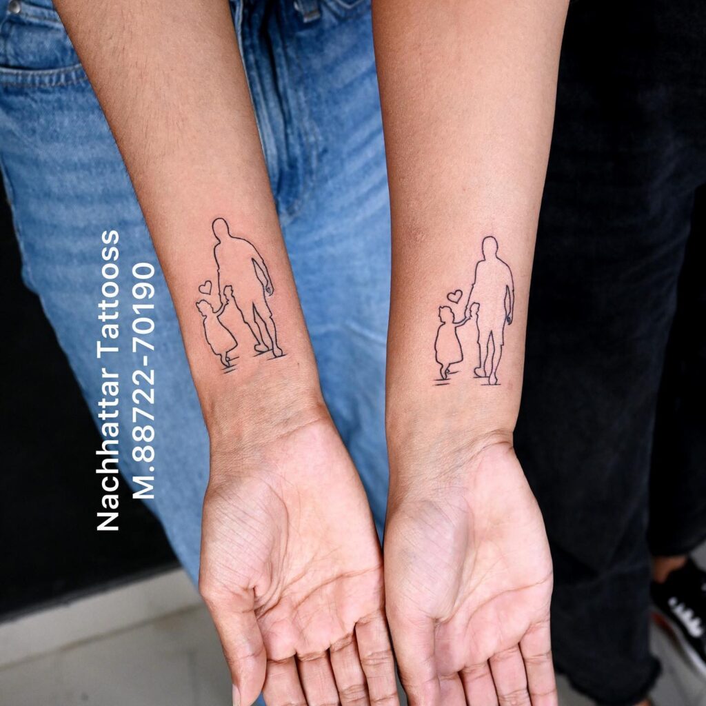 These matching minimalist tattoos beautifully depict a father and daughter holding hands, represented by simple, elegant line art. The father’s figure is highlighted in one design, while the daughter’s figure is emphasized in the other, showing how they complement each other.