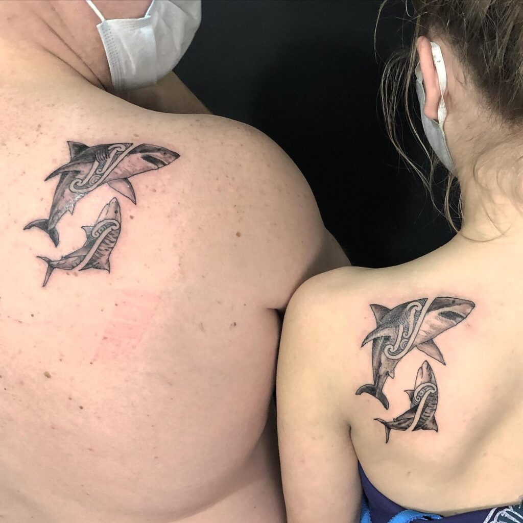 These matching tattoos feature two sharks adorned with intricate tribal designs, symbolizing strength, protection, and a deep connection to the ocean. The larger shark represents the father, offering guidance and protection, while the smaller one represents the daughter, following in her father’s path.