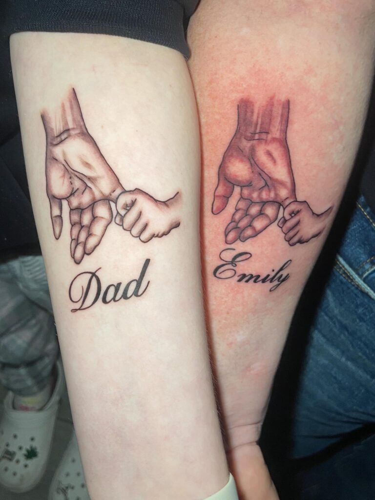 These matching tattoos feature a beautifully intricate Celtic knot, symbolizing eternal love and the unbreakable bond between a father and daughter. The designs are personalized with heartfelt handwritten messages—“Love you Emily” on the father’s tattoo and “Love You Always, Dad” on the daughter’s.