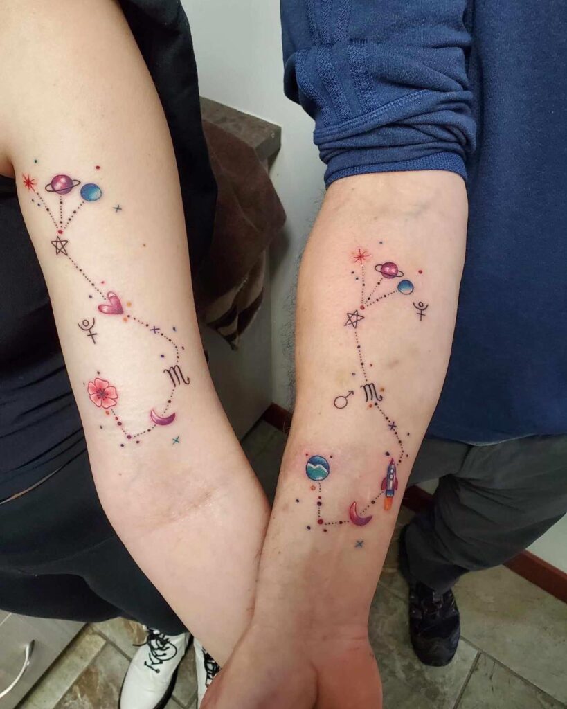 The use of vibrant colors and detailed imagery reflects their shared love for the universe and the powerful traits associated with Scorpio, such as loyalty, passion, and strength. Placed on their forearms, these tattoos serve as a constant reminder of their deep bond and shared astrological identity.
