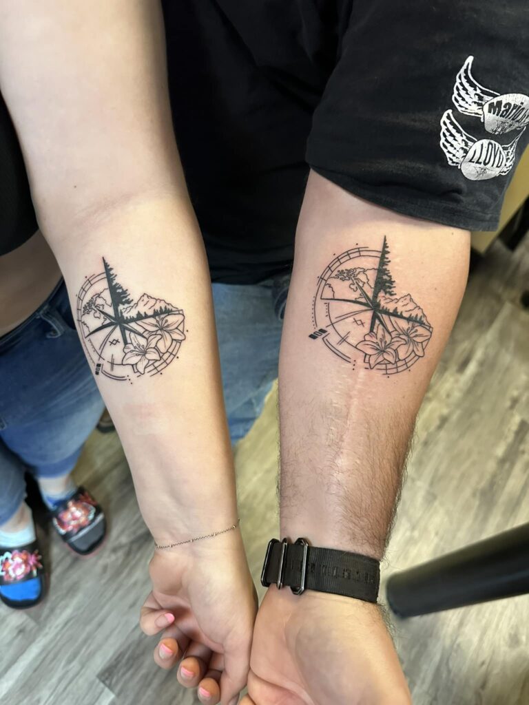 The mountains and trees emphasize their shared love for adventure and the great outdoors, while the flowers add a touch of beauty and growth to the design. Placed on their forearms, these tattoos serve as a constant reminder of their deep connection and the paths they will continue to navigate together.