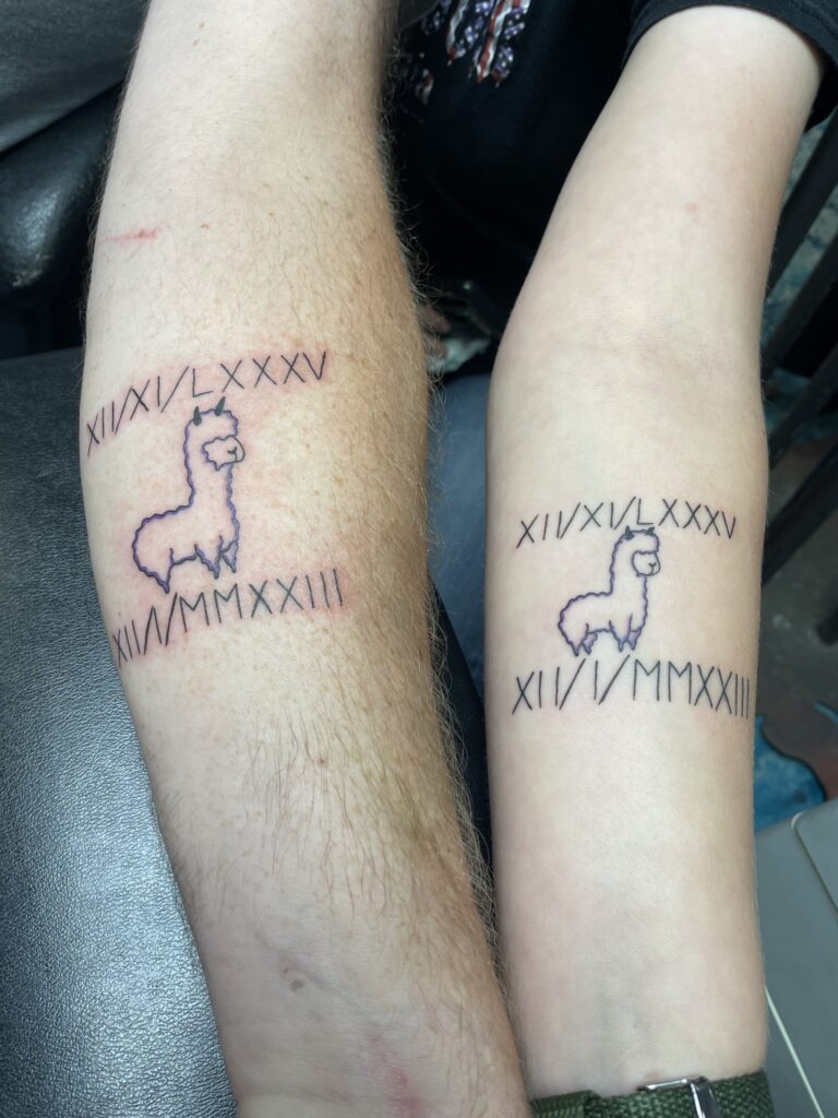 These playful matching tattoos feature a simple yet charming outline of a llama, paired with significant dates in Roman numerals. The llama adds a touch of humor and uniqueness to the design, symbolizing a shared inside joke or a mutual love for the quirky animal.