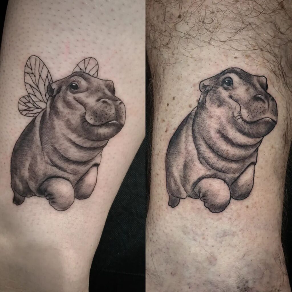 These playful matching tattoos feature a charming hippopotamus with a friendly expression, embodying the joy and light-heartedness shared between a father and daughter. The daughter’s tattoo includes a whimsical touch with wings on the hippo, adding a sense of imagination and uniqueness.