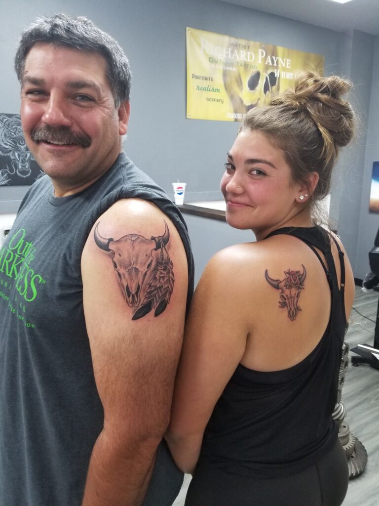These matching bull skull tattoos symbolize strength, resilience, and a deep connection to nature. The father’s tattoo features a detailed bull skull adorned with feathers, adding an element of tradition and spirituality, while the daughter’s tattoo showcases a similar bull skull with a delicate rose, representing beauty and feminine strength.