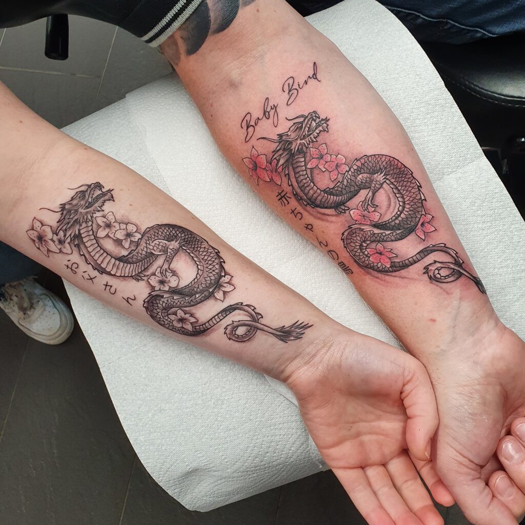 This stunning matching tattoo set features intricate dragon designs intertwined with delicate cherry blossoms, symbolizing strength, wisdom, and the beauty of life. The addition of the personal inscriptions, like “Baby Bird,” adds a heartfelt and unique touch, making these tattoos deeply personal.