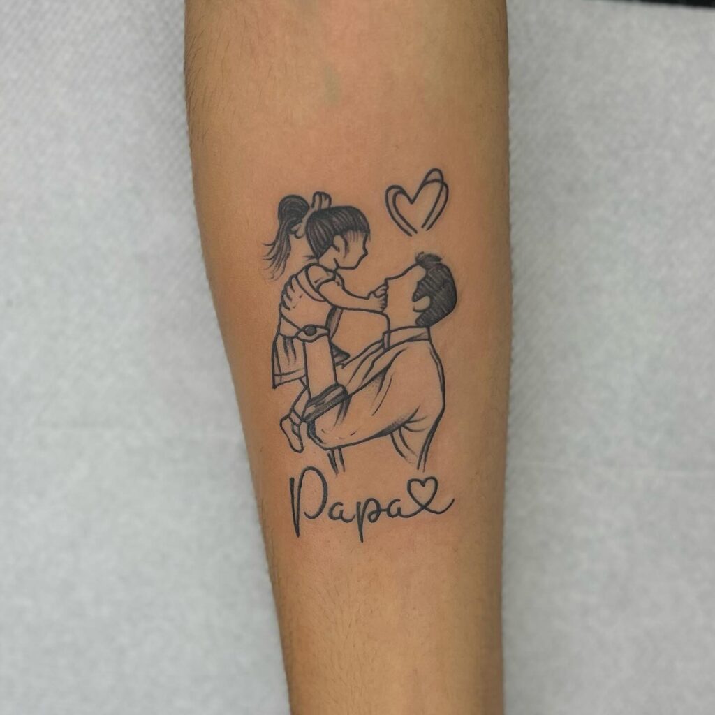 This heartwarming tattoo depicts a father lifting his young daughter into the air, capturing a moment of pure joy and love. The simple, yet detailed, line art emphasizes the bond between father and daughter, with the word “Papa” written below, adding a personal and affectionate touch.