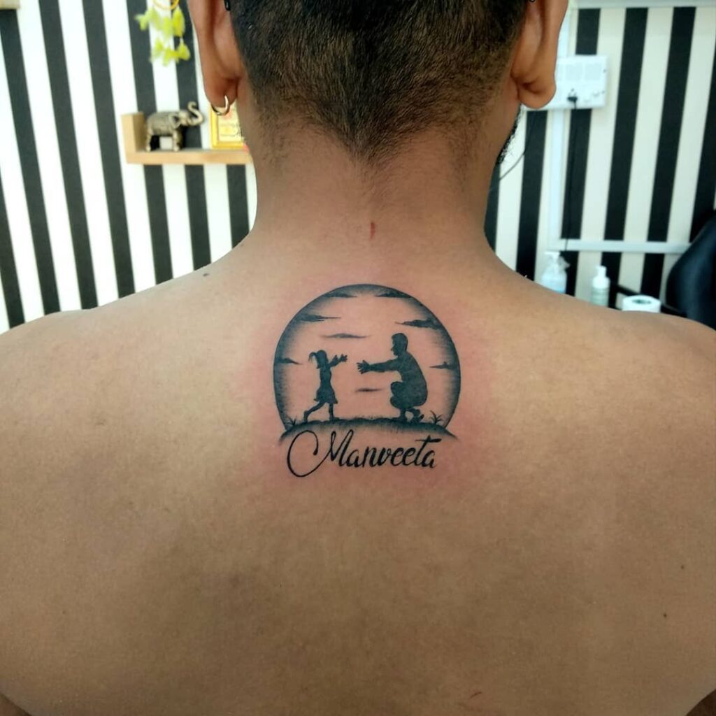 The name is elegantly written beneath the image, adding a personal and meaningful touch to the design. Placed on the upper back, this tattoo serves as a powerful tribute to the unconditional love and connection between father and daughter, representing a bond that will forever be cherished.