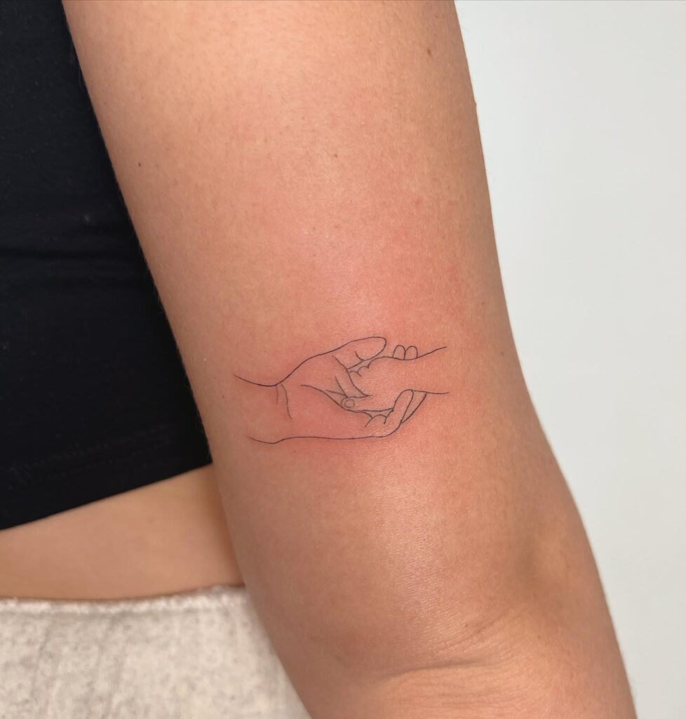 This minimalist tattoo depicts the simple yet powerful image of two hands gently holding each other, capturing the deep bond between a father and daughter. The fine line design emphasizes the tenderness and connection shared, with the larger hand symbolizing the father’s protection and the smaller hand representing the daughter’s trust and love.